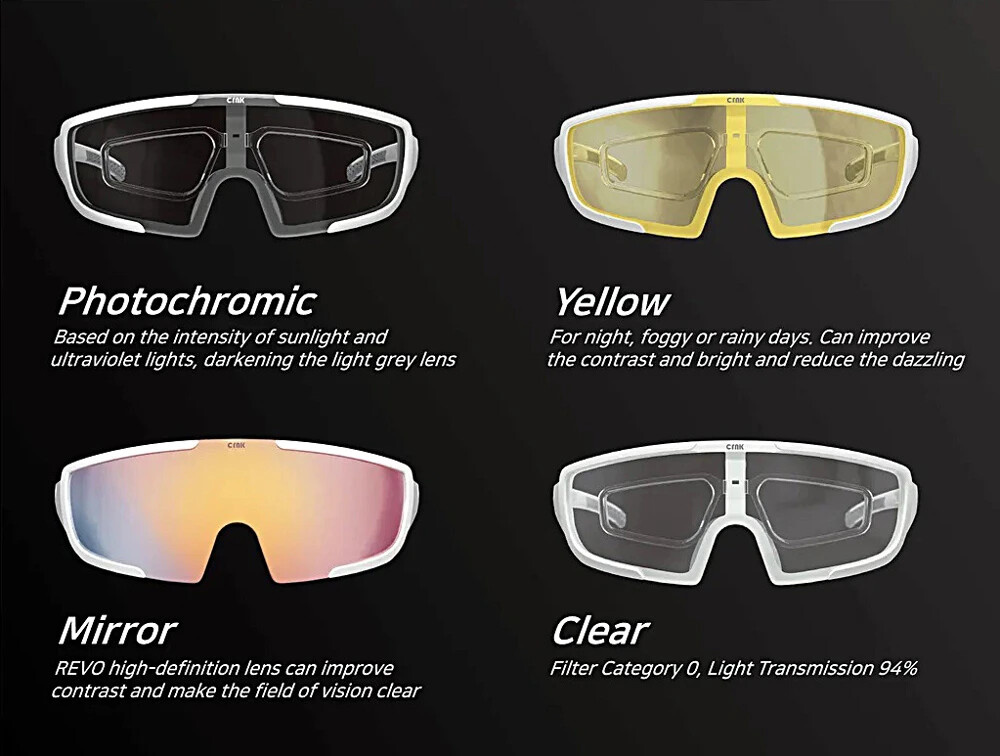 Sada čtyř vyměnitelných skel: zrcadlové / čiré / fotochromatické / zjasňující