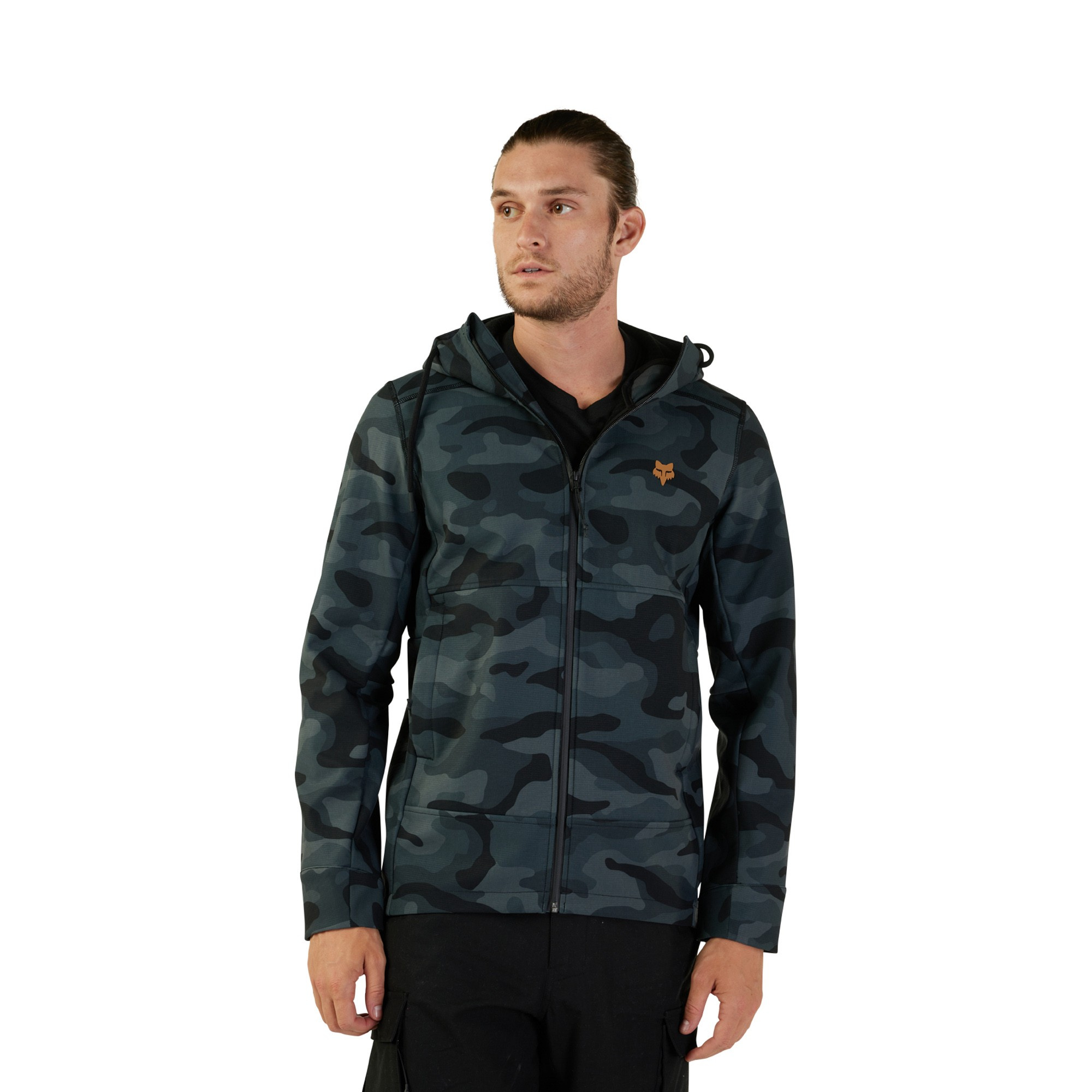 Pánská softshellová bunda Fox v pohodlném širším střihu ze 3-vrstvého voděodolného materiálu s hodnotou vodního sloupce 10K/5K. Rovný střih, hřejivá polyesterová podšívka, zapínání na přední voděodolný zip. Boční kapsy, stahování kapuce šňůrkou, silikonové logo Fox na hrudi. Odolný DWR zátěr materiálu proti větru a dešti. Složení materiálu: 94% polyester, 6% spandex; záda: 100% polyester. Gramáž 320g. Maskovaný celopotisk.
