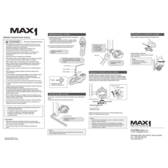 Jednostranné pedály MAX1 SPD Tour.- kluzné ložisko- použití Cross/MTB- nastavitelné předpětí pružiny imbusovým šroubem 3 mm- součástí kufry pro přidělání na obuv a šroubky- pro montáž použijte imbusový klíč 8 mm- hmotnost 346 g/pár- černéKompletní sortiment produktů na MAX1.cz.Výrobce: Cyklomax, spol. s r.o., Pardubická 504, 533 52 Srch. E-mail: info@cyklomax.cz