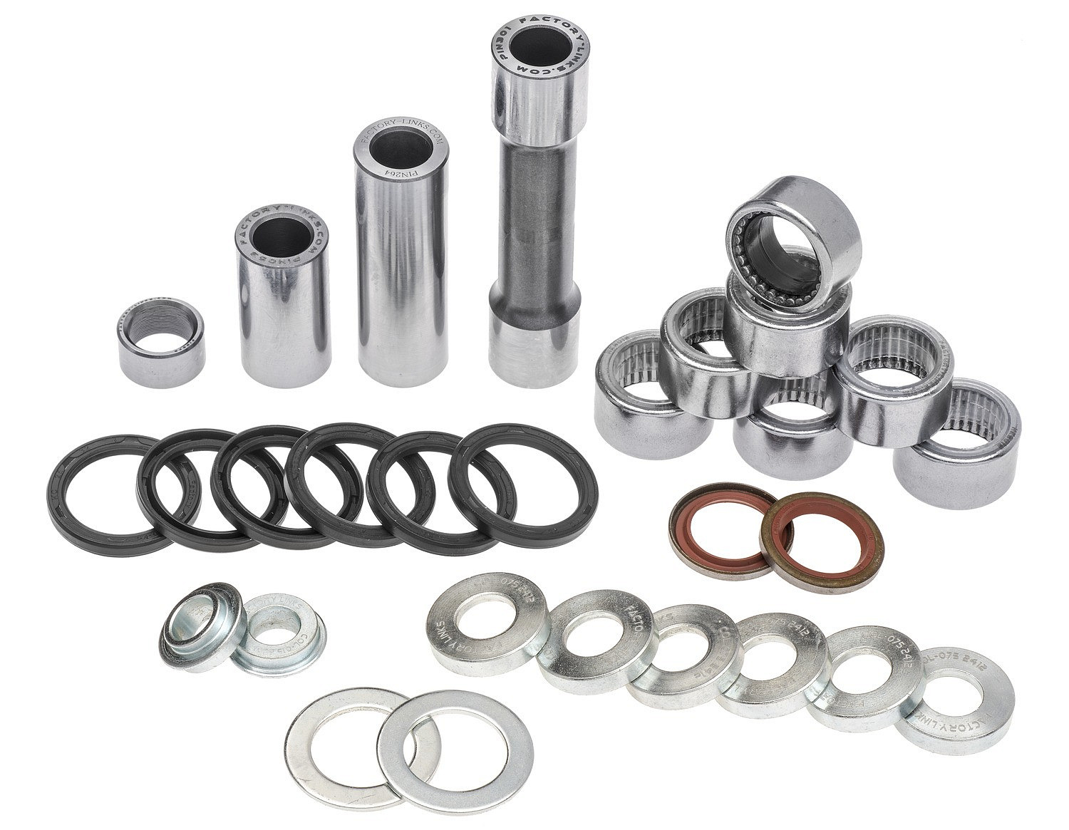 - Sady Factory Links vždy obsahují konkrétní komponenty (čepy, ložiska, pouzdra, příložky, podložky, rozpěrky, simeringy, kloubová ložiska, jehlová ložiska) pro konkrétní motocykly (detaily v zařazení).
