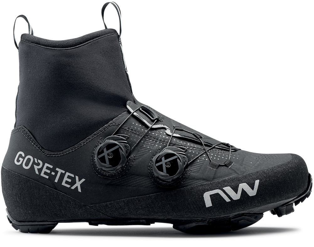 Pánské XC tretry Northwave s karbonovou podrážkou Michelin Hyperlite XC s tvrdostí 14/15. Svrchní část je vyrobena patentovanou technologií Ultra light X-Frame 2 pro omezení nežádoucích tlaků a také pro ideální přenos sil. Utahování rychlosystémem SLW3 s možností jemného nastavení. Integrovaná membrána Gore-Tex Duratherm. Neoprenový kotníkový úplet neomezuje pohyb a chrání před nepříznivými vlivy. Vnitřní 4-vrstvá vložka Arctic 4L (kombinace EVA materiáu a hliníku) se stará o izolaci tělesného tepla, reflexní detaily po obvodu pro lepší viditelnost. Hmotnost 440 g. Velikost uvedena v EU číslování.