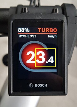Displej záměrně nezobrazuje skutečnou rychlost, protože by jinak systém Bosch Smart System úpravu rozpoznal a zablokoval její funkci. Reálnou rychlost však lze snadno odečíst z posledních dvou číslic na displeji (viz obrázek níže).