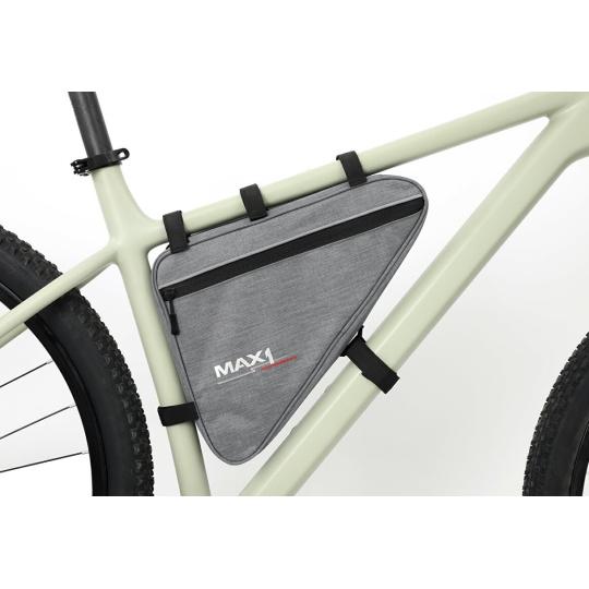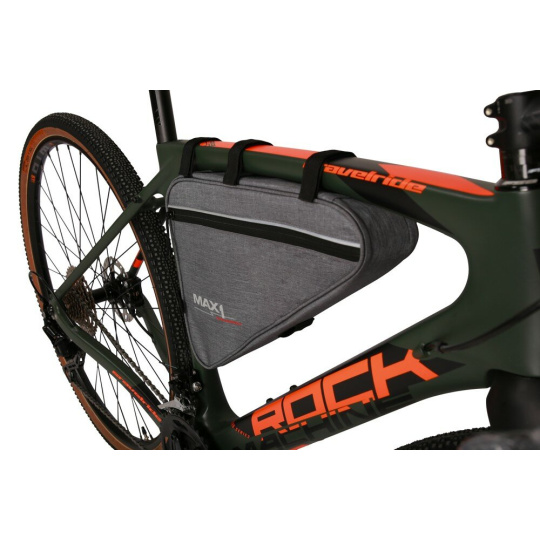 Největší rámový trojúhelník MAX1 Triangle XL.Ideální pro přepravu všech nutných věcí na Vašem cyklistickém výletě. Pojme vše nutné včetně nářadí a oblečení.3 kapsy pojmou 5,75 l objemu.Specifikace:• 2 kapsy na zip na obou stranách - 1x velká, 1x malá• 1 kapsa ze síťoviny• vyrobeno z voděodolného materiálu• jednoduchá montáž na velcro pásky• reflexní prvky a loga na bocích• plastová vodítka zipů pro jednodušší ovládání• stylové šedé provedeníSpecifikace:Hmotnost: 350 gRozměry brašny:- délka: 34 cm- šířka: 6,5 cm- výška: 26 cm- objem brašny: 5,75 l- nosnost: 2 kg