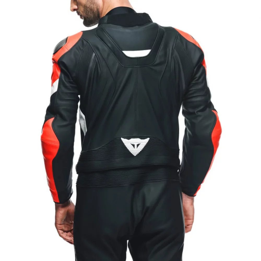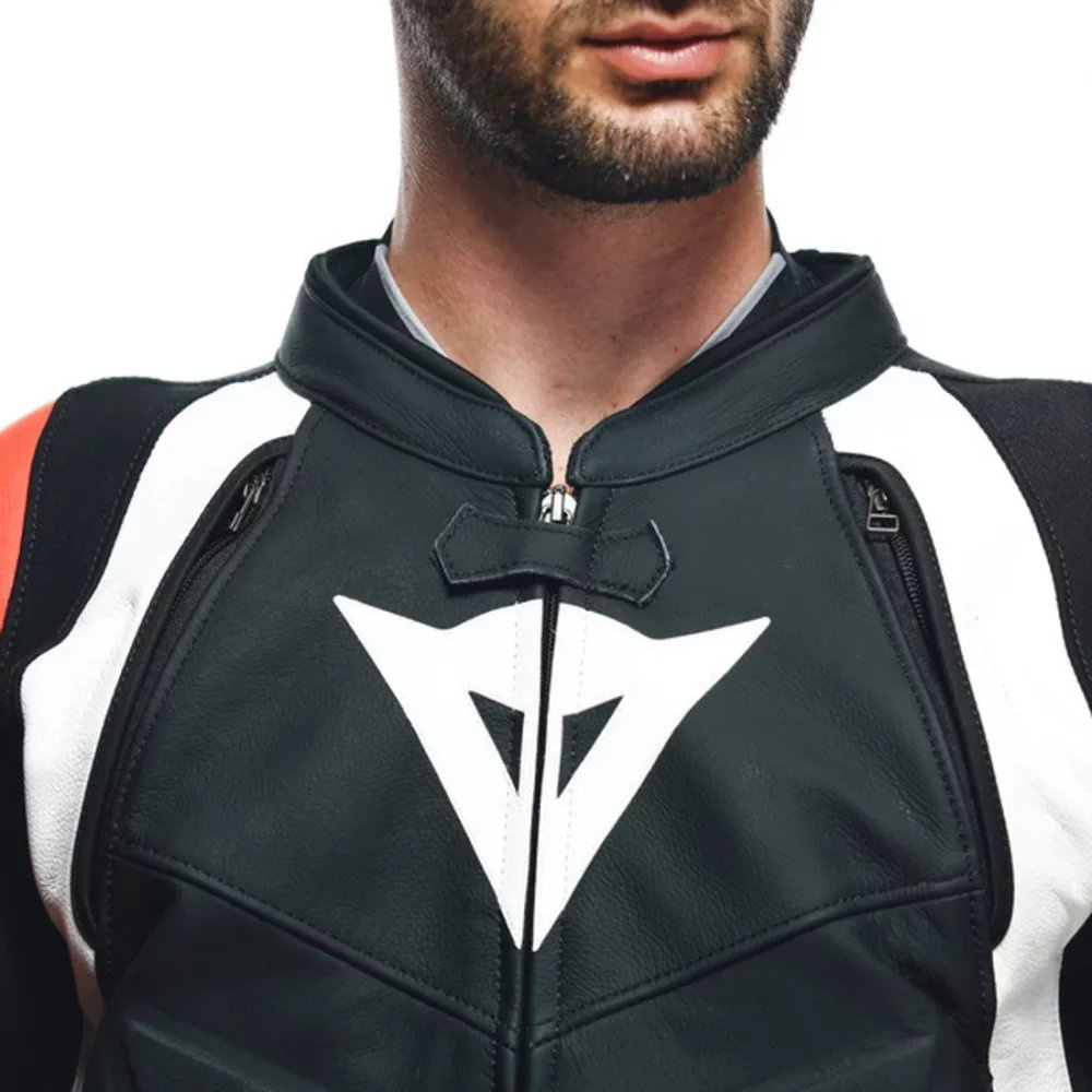 Ikona Dainese. Dvoudílný motocyklový oblek z hovězí kůže Tutu s hliníkovým jezdcem na ramenou, aerodynamickým hrbem a strečovými vložkami pro maximální svobodu pohybu.
