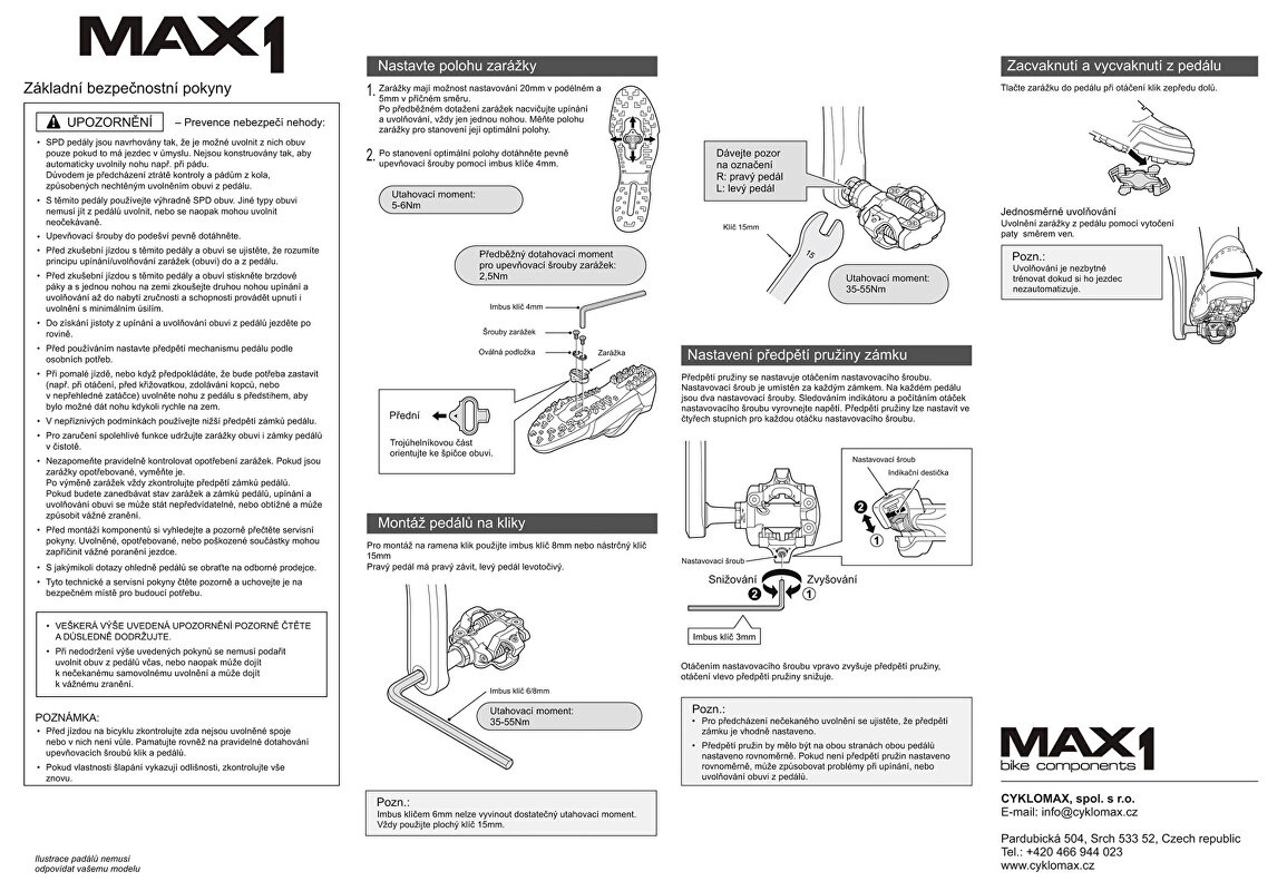 Jednostranné pedály MAX1 SPD Tour.- kluzné ložisko- použití Cross/MTB- nastavitelné předpětí pružiny imbusovým šroubem 3 mm- součástí kufry pro přidělání na obuv a šroubky- pro montáž použijte imbusový klíč 8 mm- hmotnost 346 g/pár- černéVíce na: MAX1.CZ.Dovozcem značky MAX1 do ČR je společnost Cyklomax, spol. s r.o.