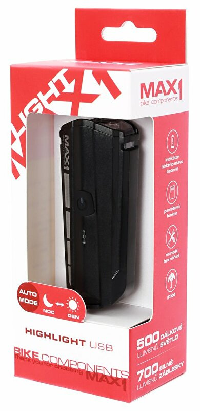 Výkonné přední světlo na řidítka MAX1 Highlight s dobíjením přes USB s vestavěným akumulátorem.Technické parametry:• 1 bílá LED• výkon 700 lm silné záblesky / 500 lm svícení• dobíjecí baterie lithium-ion polymer• velikost 84 × 37,3 × 27,3 mm• univerzální tvar držáku pro kulatá řidítka i aero• hmotnost 66 g• doba nabíjení 3 hSvětelné módy a výdrž• dálkové světlo - 4 h• potkávací světlo - 8 h• denní blikání - 20 h• silné záblesky - 16 h• automatický mód - 4-20 hAutomatický mód upraví režim světla v závislosti na světelných podmínkách. V nocí svítí, ve dne bliká.Ovládání• pro zapnutí podržte vypínač cca 1,5 s• pro vypnutí podržte vypínač cca 1,5 s• pro aktivování automatického módu při zapínání držte vypínač 3 s (modrá LED)• přepínání jednotlivých módů mačkáním tlačítka• po opětovném zapnutí bude v paměti poslední použitý módDoporučení a informace:Baterie jsou bezpaměťové, proto baterie dobíjejte bez obav na maximum po každém používání. Pokud ji vybijete na minimum, nabijte, co nejdříve. Skladování úplně vybitého světla zkracuje životnost baterií. Pokud světlo nepoužíváte, výrobce doporučuje min. 1x za 3 měsíce baterii ve světle zkontrolovat. Pokud svítí červená LED je potřeba baterii bezpodmínečně nabít. Elektronika kompletně řídí nabíjení a vybíjení včetně indikace stavu baterie a chrání její přebití nebo úplné vybití. Pokud budete světlo používat, jinak než na kole, nikdy ho nezakrývejte. Při nabíjení mějte světlo pod dozorem, nezakrývejte a nepokládejte na hořlavé materiály, papír, koberec a pod.Kompletní sortiment produktů na MAX1.cz.