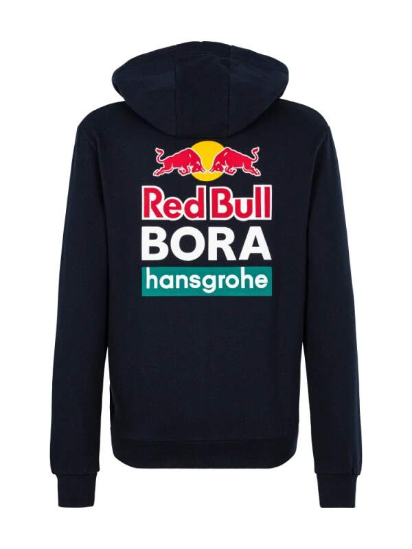 Mikina s kapucí cyklistického týmu Red Bull Bora Hansgrohe s velkým logem na zadní straně. Tmavě modré provedení, krásné zpracování i barvy.