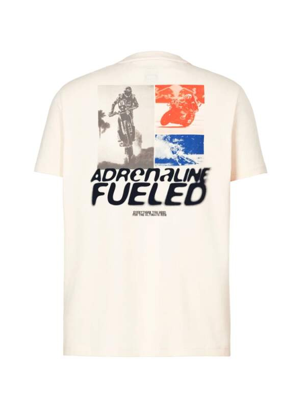 Stylové tričko z oficiální kolekce KTM Red Bull Racing. Světlé tričko s jedinečným potiskem fotografií motocyklů KTM na zadní straně. Týmové logo i barvy. Pohodlné na nošení Bavlna Luxusní potisk na zadní straně Elastické Vystouplé logo KTM