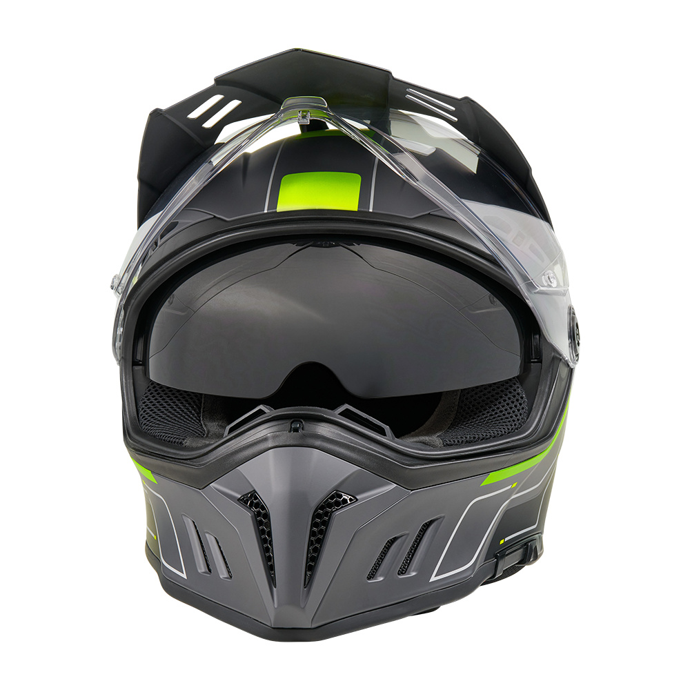 Nově vyvinutá přilba se 2 vnějšími skořepinami a 3 EPS pro větší bezpečnost a dokonalé přizpůsobení. Skořepina je vyrobena z vysoce kvalitního ABS. Sportovní, těsně přiléhající konstrukce pro stabilní usazení, snížený pohyb přilby a optimální kontrolu při vysokých rychlostech - ideální pro dynamickou jízdu. Optimalizovaná cirkulace vzduchu díky několika uzavíratelným větracím otvorům a vnitřním větracím kanálkům. Připraveno pro instalaci inteligentního bezpečnostního senzoru Quin. Snadné a rychlé vyjmutí lícnice díky systému E.Q.R.S. s nouzovými pásky. Bezpečné upnutí díky zapínání na bradový pásek Microlock. Polstrovaná komfortní vložka, odnímatelná, pohlcující pot a pratelná. Bluetooth Ready s vnitřními dutinami pro reproduktory (jednotka Bluetooth není součástí dodávky). Mimořádně široké zorné pole pro maximální přehled v náročném terénu a zvýšenou bezpečnost při dlouhých jízdách na silnici i mimo ni. Součástí balení je Pinlock® MaxVision proti mlžení (není instalován). Dokonalý výhled za každého počasí díky čirému plexi a integrované sluneční cloně. Splňuje bezpečnostní normy DOT a ECE 22.06.