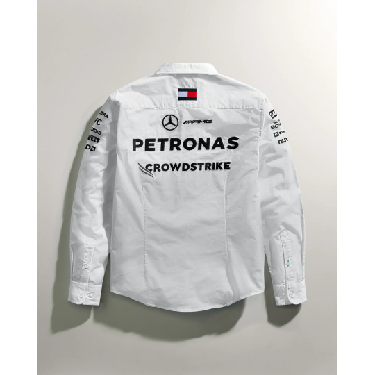 Bílý týmová košile Mercedes AMG F1 nošená jezdci a členy týmu v sezóně Formule 1. Košile Mercedes AMG F1 s logy sponzorů, prvky Tommy Hilfiger, bílé provedení. Pohodlná na nošení, krásné barvy, všechna loga vyšitá.