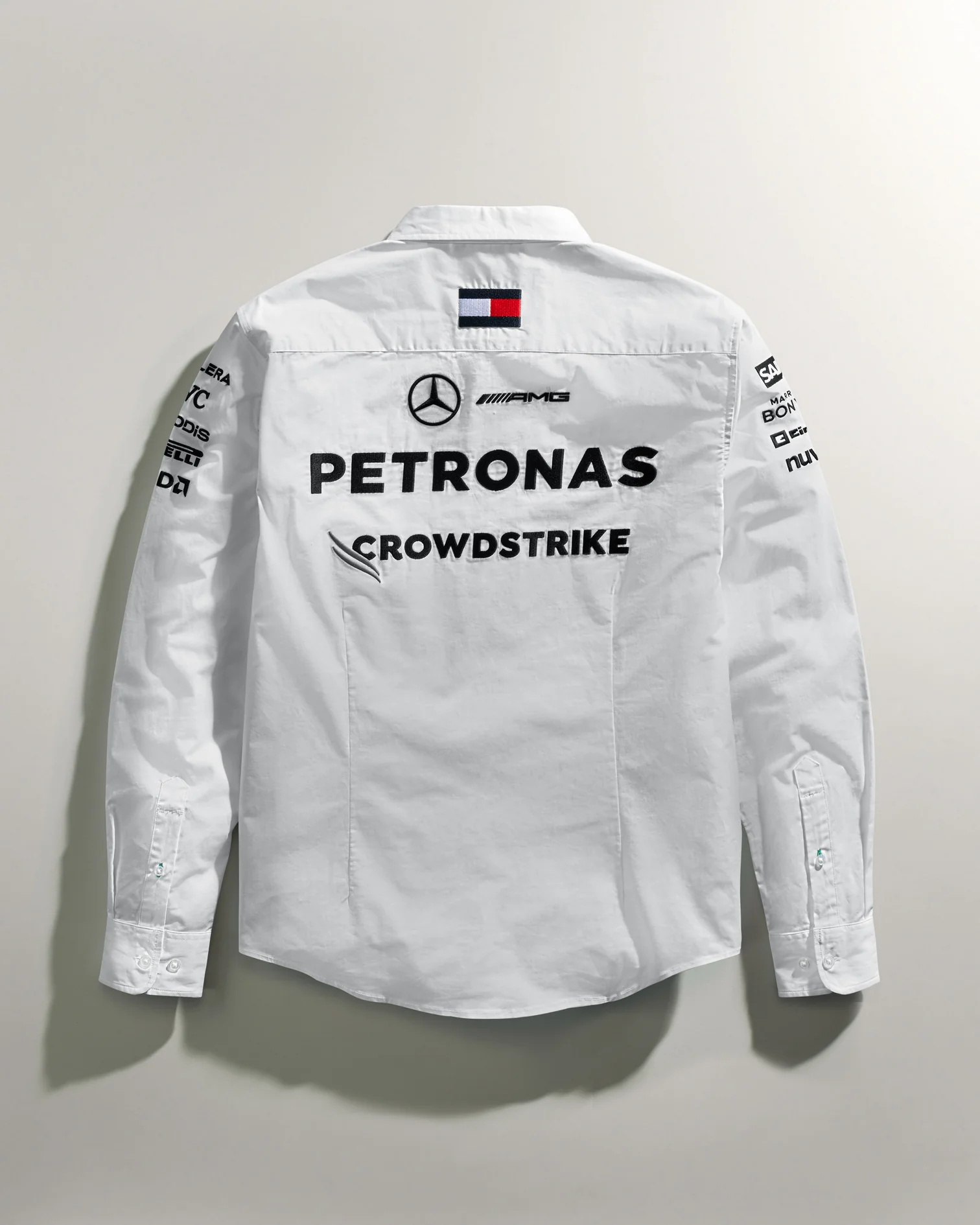 Bílý týmová košile Mercedes AMG F1 nošená jezdci a členy týmu v sezóně Formule 1. Košile Mercedes AMG F1 s logy sponzorů, prvky Tommy Hilfiger, bílé provedení. Pohodlná na nošení, krásné barvy, všechna loga vyšitá.